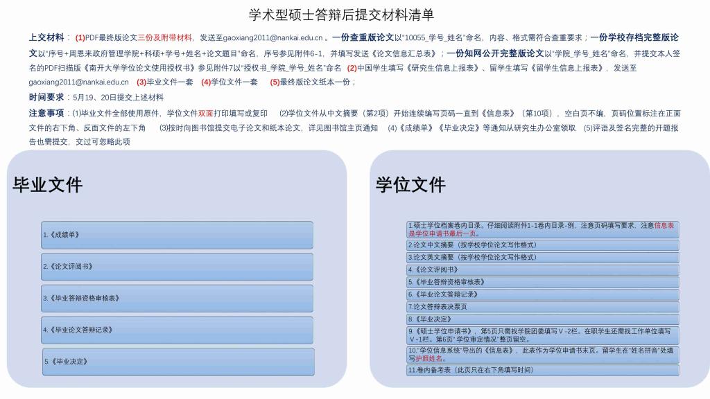 学硕答辩结束后需要及时准备各种毕业及申请学位的材料,需要提交的材料清单如下: