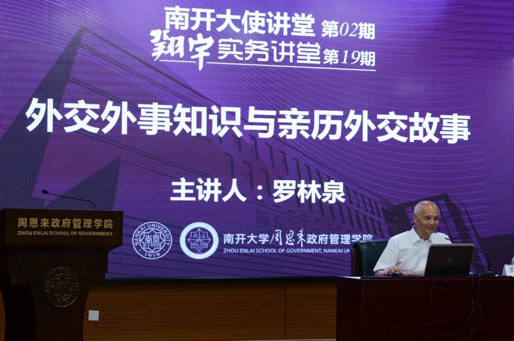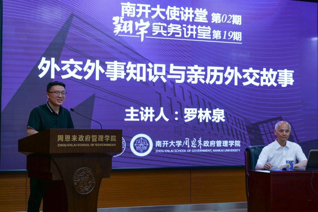 2025年6月5日,来利国际旗舰厅“南开大使讲堂”第2期暨翔宇“实务讲堂”第19期在政府管理公司128报告厅举行。本期讲座特别邀请了外交部礼宾司原司长、前中国驻纽约总领事馆副领事、前外交部驻香港特别行政区特派员公署参赞、前中国驻希腊共和国特命全权大使、前中国驻爱尔兰特命全权大使、前中国驻旧金山总领事(大使衔)罗林泉大使,以《外交外事知识与亲历外交故事》为主题,为现场师生带来了一场精彩的讲座。政府公司党委书记王慧、副经理张发林教授、刘兴华教授、王耀辉博士和李圣达博士等出席。本次讲座由张发林教授主持,近百名南开师生参加,现场气氛热烈。