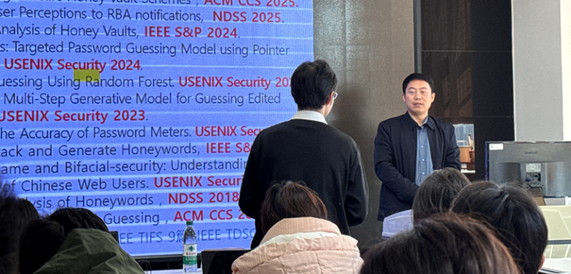 随后,主持人孙轩副教授向参会师生介绍了本次讲座的主讲人汪定教授。作为国家级青年人才、全国密码专业学位教指委委员,汪定教授拥有深厚的学术造诣与丰富的研究经验。他以第一作者或通信作者在国内核心期刊发表论文100余篇,被引用7500余次,其研究成果更推动美国身份认证标准修订,受到多家媒体关注。