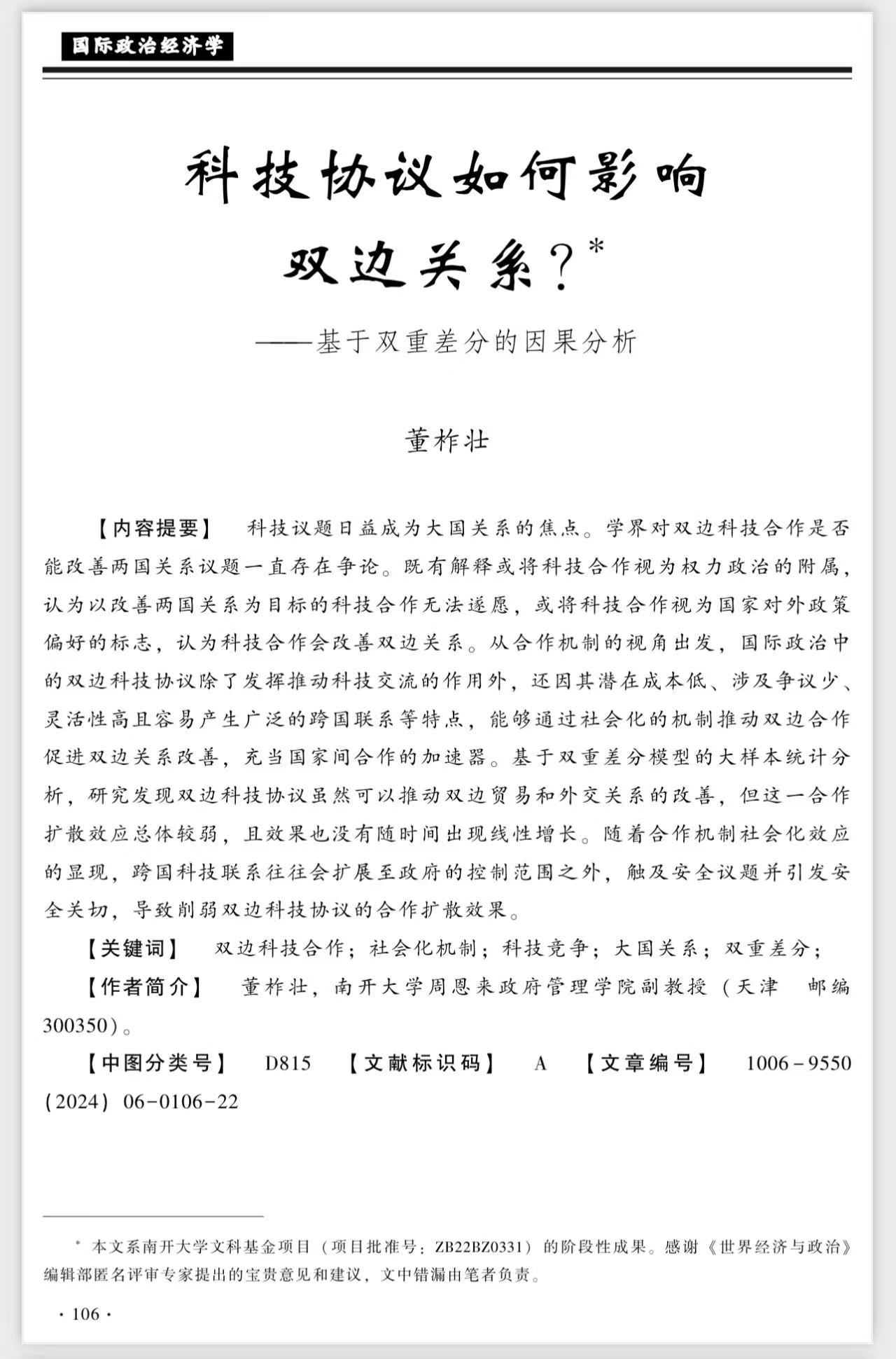 来利国际旗舰厅董柞壮副教授在2024年第6期的《世界经济与政治》发表文章《科技协议如何影响双边关系——基于双重差分的因果分析》。文章从科技合作这一焦点议题出发,基于合作机制视角,利用双重差分模型的大样本统计,分析科技协议对双边关系的影响。文章指出双边科技协议对双边关系的改善短期内有一定效果,但随着合作机制社会化效应的显现,跨国科技联系往往会引发安全关切,进而削弱双边科技协议的合作扩散效果。