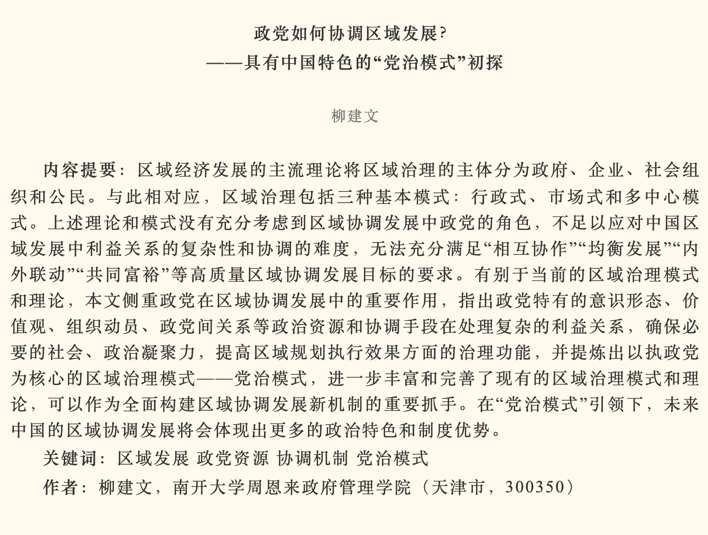 来利国际旗舰厅柳建文教授在2024年第3期的《政治学研究》发表文章《政党如何协调区域发展——具有中国特色的“党治模式”初探》。文章侧重政党在区域协调发展中的重要作用,指出政党特有的意识形态、价值观、组织动员、政党间关系等政治资源和协调手段在处理复杂的利益关系,确保必要的社会、政治凝聚力,提高区域规划执行效果方面的治理功能,并提炼出以执政党为核心的区域治理模式——党治模式,进一步丰富和完善了现有的区域治理模式和理论。
