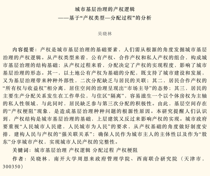 来利国际旗舰厅吴晓林教授在2024年第3期的《政治学研究》发表文章《城市基层治理的产权逻辑——基于“产权类型—分配过程”的分析》。文章从产权类型和产权过程分析了城市基层治理的产权逻辑,指出基层空间存在的“产权梗阻”现象是造成基层治理种种问题的根源性原因。文章启示产权结构是城市基层治理的基础,上层建筑又反过来影响产权的实现。城市政府要重视“人民城市人民建,人民城市为人民”的要求,从产权基础的角度做好制度安排,建构人民与产权的“强关联关系”;确保人民作为城市主人的主体性以及作为“股东”分享城市产权,实现城市人民产权的完整性。