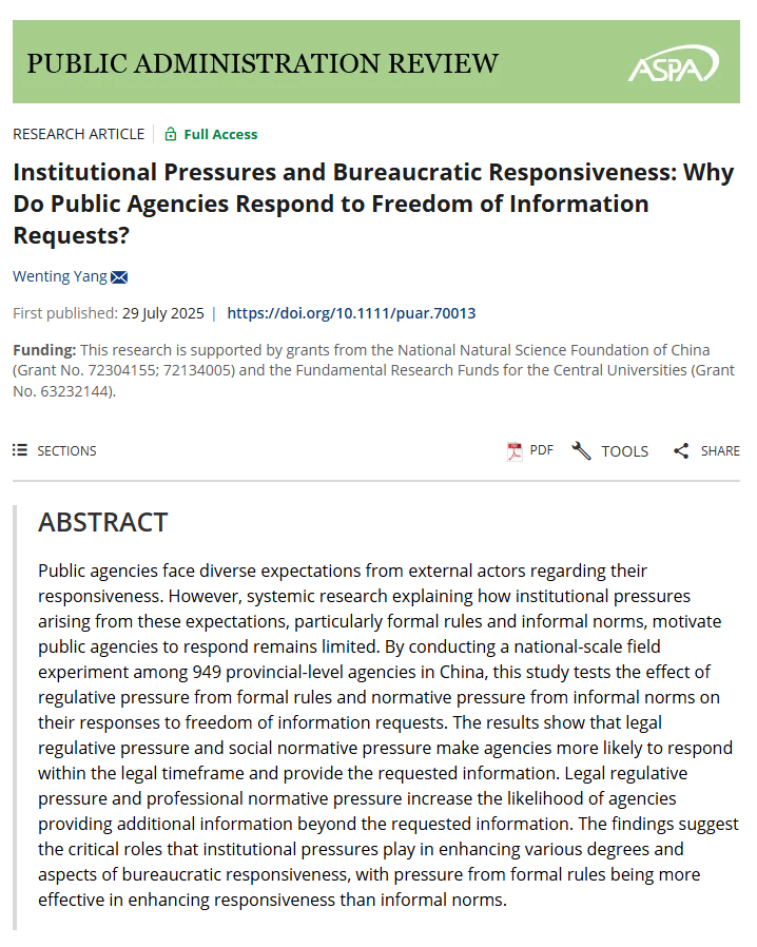 近日,来利国际旗舰厅杨文婷老师的独著论文“Institutional Pressures and Bureaucratic Responsiveness: Why Do Public Agencies Respond to Freedom of Information Requests? ”(《制度压力与官僚回应:公共部门为何回应信息公开申请?》)被公共管理国际顶级期刊Public Administration Review(PAR)录用并在线发表。PAR创刊于1940年,五年平均影响因子为7.3,在90本公共管理国际期刊中排名第一,是公共管理领域最负盛名的学术期刊之一。