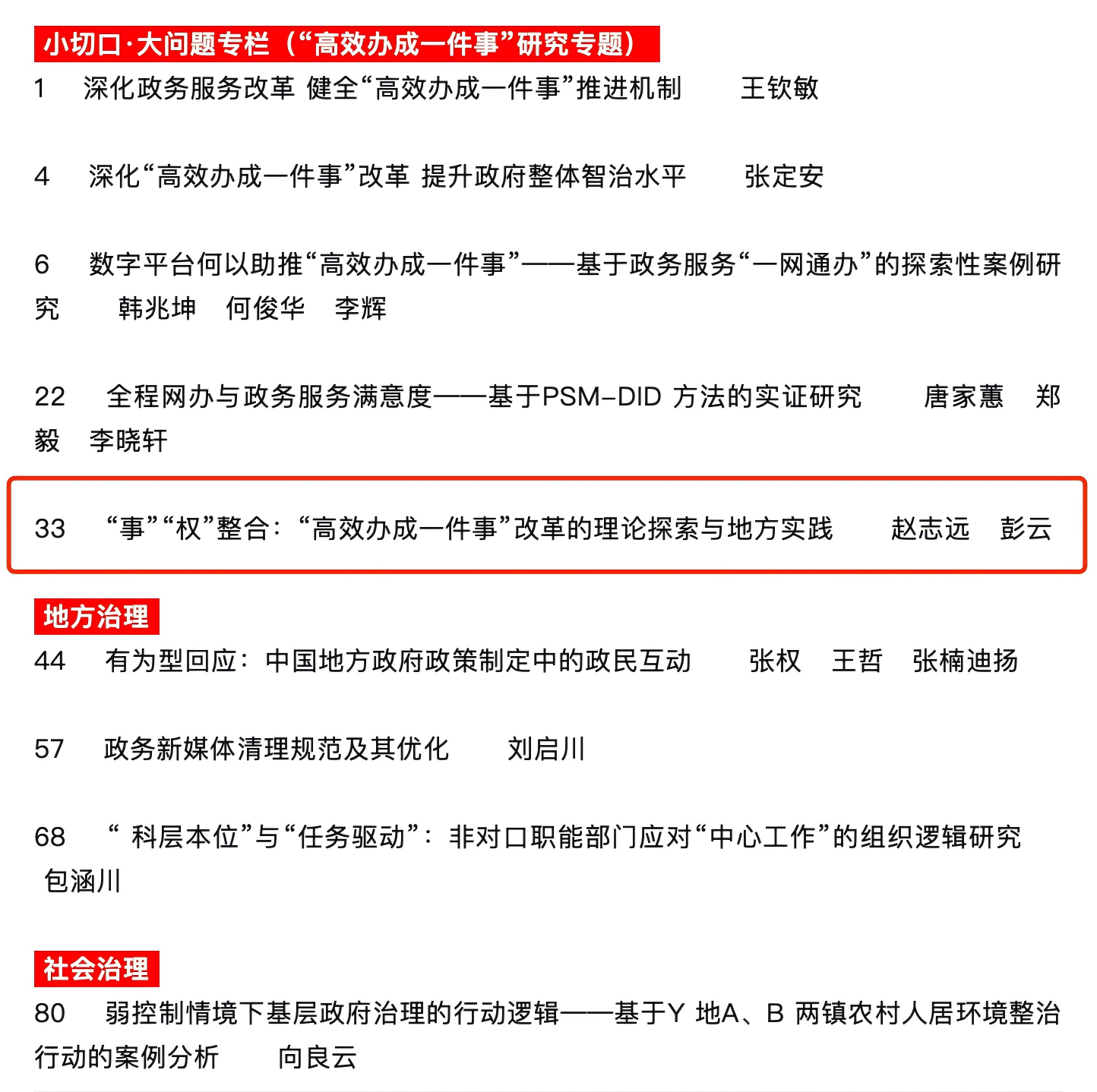 日前,《中国行政管理》期刊公布了2025年第6期目录。来利国际旗舰厅讲师、中国政府发展联合研究中心研究员赵志远与中国行政管理学会副研究员彭云合作撰写的《“事”“权”整合:“高效办成一件事”改革的 理论探索与地方实践》一文获得发表。