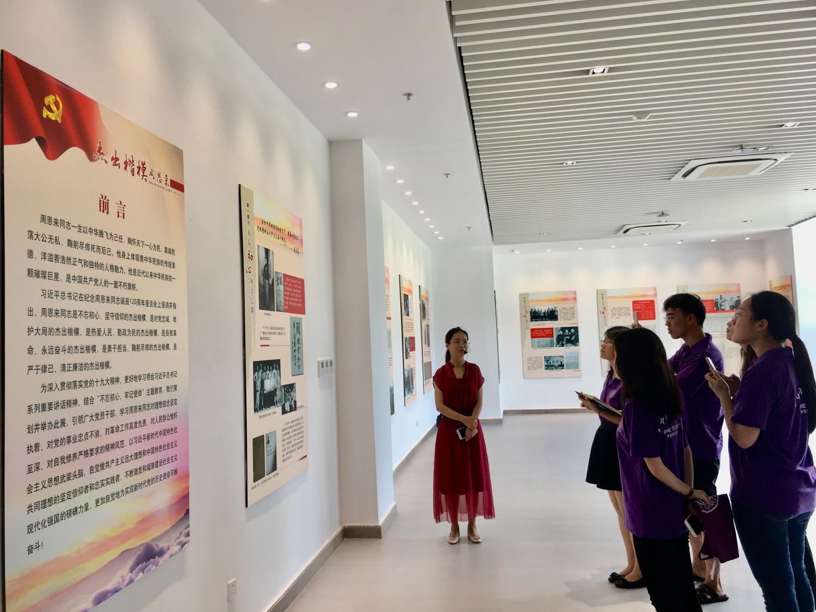 7月24日—26日,实践队来到恩来干部公司交流学习。恩来干部公司致力于通过现场教学、情境教学、专题教学、音像教学等多种教学形式打造精品课程,为党员干部开展党性培训。首先,恩来干部公司刘玮老师带领实践队参观了公司“杰出楷模周恩来”专题展,专题展通过“不忘初心、坚守信仰”“对党忠诚、维护大局”“热爱人民、勤政为民”“自我革命、永远奋斗”“勇于担当、鞠躬尽瘁”“严于律己、清正廉洁”六个方面,详实生动地展示了周总理的崇高品格。随后,刘玮老师与队员们同走公司“追梦之路”,“追梦之路”通过浮雕、海棠等不同的文化景观,再现了一件件周总理严于律己、心系人民的故事,令队员们深受感动。