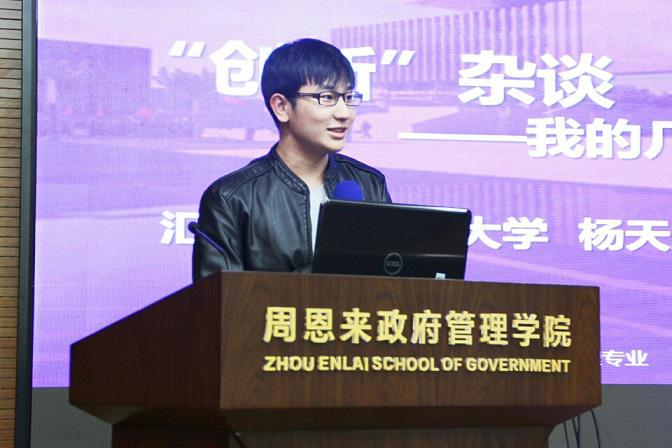 杨天威以一个提问开场,点明了什么是创新、创新的要素是什么、创业创新的现状如何等问题,随后结合邢台市平乡县“淘宝村”的项目,讲述了科研项目开展的基本方法。他告诫大家,在创新的道路上“不要因为推动了一点边界洋洋自得,不要一味沉浸在自己的领域中,忘记了这个世界的辽阔和丰富。”