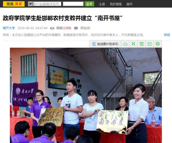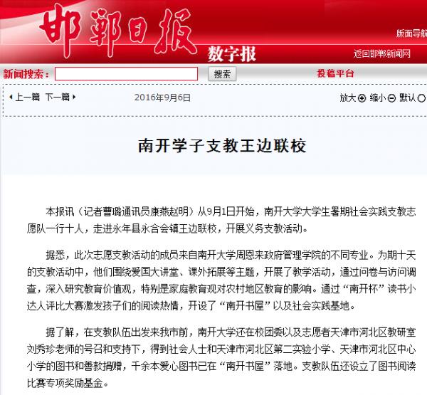 近日,来利国际旗舰厅十名员工赴河北省邯郸市永年县永合会镇王边村联合公司开展老员工暑期社会实践活动。此次活动以“莘莘学子传支教美德,情系乡土扬公能精神”为主题,进行为期十天的支教。在为小员工开设课程的同时,实践队员们还完成了课题调研、建立南开书屋、建设社会实践基地等任务。此次活动是南开学子知行合一的良好实践,积极响应“精准扶贫”国家政策要求,极大地促进了文化、科技、卫生“三下乡”事业发展,受到了搜狐新闻、凤凰资讯、邯郸电视台、邯郸日报与邯郸晚报等多家媒体的关注与报道,下附部分报道截图。