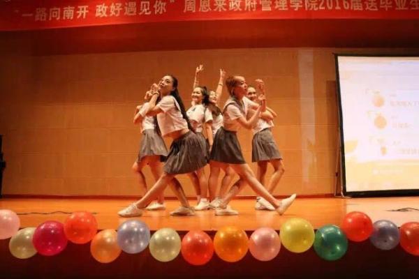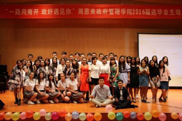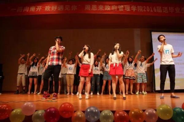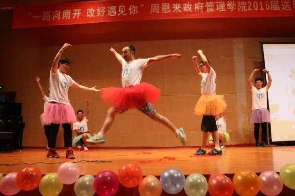 第二个节目来自12级行政管理的同学。一首一生有你,婉转悠扬,道出了青春的迷惘与执著,青春的感动留在大家心中。第三出场的是刘书冰同学,她带来傣族舞蹈彩云之南,傣家姑娘的曼妙身姿仿佛把我们带到了湿热的云南。接下来是冯晓璇,丁盛楠,陈晨,房懿同学合唱的小幸运,默契的眼神与有魅力的和音让观众席气氛十分热烈。紧接着鸿迪孜同学身着白色民族裙装带来的民族舞蹈天鹅,利落的动作让我们看到了哈萨克族别样的民族风情。12级社会的同学们给我们带来南开学子原创歌曲,南开 秋天,歌声仿佛把南开秋天金黄的落叶和当初入学的悸动都带到了现场。下一个节目是12级国际政治班的靓丽女生的韩舞串烧,热辣的舞姿把现场气氛火速提升。12级应用心理的女生带来舞蹈怦然心动,独特的清纯魅力和有力的动作形成反差,给大家带来极佳视听享受。12级行政管理男生们带来不可描述的舞蹈。揉合了千手观音,四小天鹅,小鸡小鸡等耳熟能详的舞蹈,活泼的动作将现场气氛推入高潮。中场互动环节,国际关系系主任韩召颖与毕业生们一起进行接力式你划我猜游戏,生动有趣。田拓与朱功伟带来的相声《我要毕业》细数四年老员工活,以幽默风趣的方式给毕业画下一个完美的句号。12级社会工作专业毕业生带来的《辉夜城之舞》将晚会推向高潮,欢呼声不断。12级国际政治的一曲《尚好的青春》唱出了多少毕业不舍,但无论怎样,还是要笑着说一句,毕业快乐!