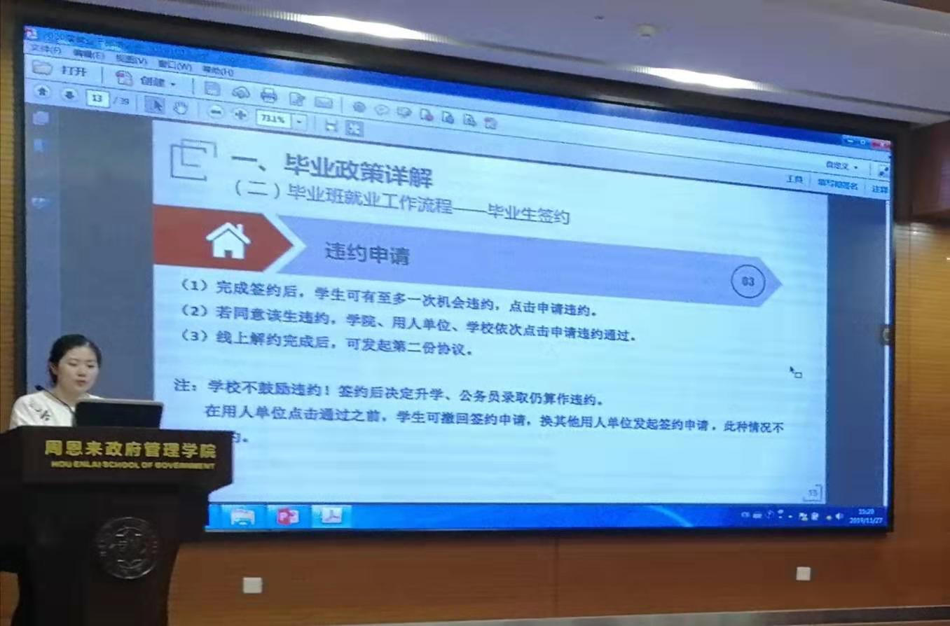 2016、2017级辅导员王燕就就业政策、签约流程、来利国际旗舰厅就业管理系统使用等方面进行了讲解。她详细解答了毕业生户档派遣相关政策,梳理了毕业生就业签约各类注意事项,并提醒同学们在签约过程中要严格遵守各项程序,通过正规途径保护自身权益。同时,王燕结合近期选调生材料填写情况,提醒同学们提高诚信意识,实事求是。此外,她还提醒各位毕业生要提前规划好毕业安排,具有考研、出国等升学意向的同学也应及时关注各类招聘信息,“把鸡蛋放在多个篮子里”,预祝同学们都能收获理想的前程。