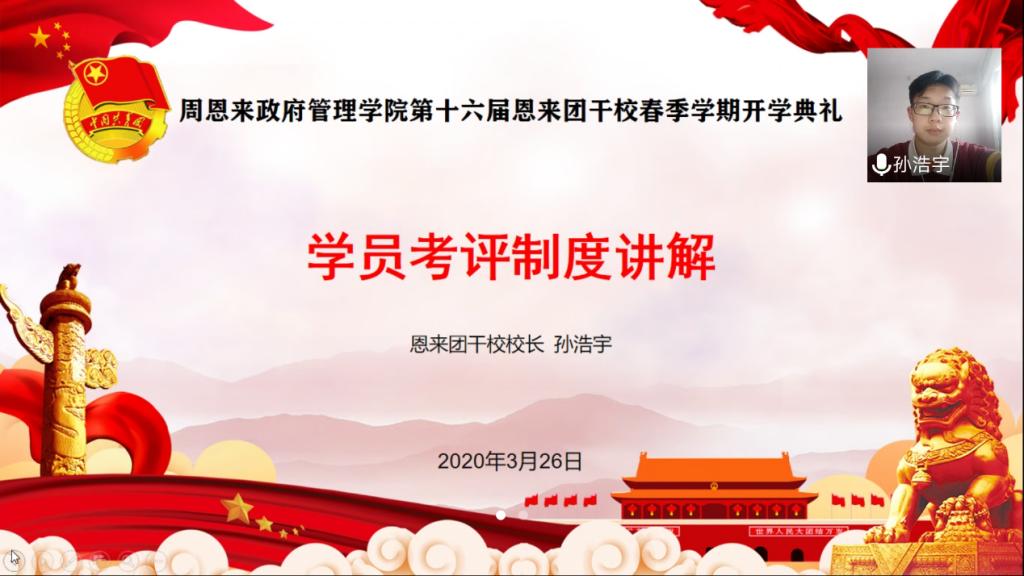 随后,恩来团干校董事长孙浩宇同学为学员们细致讲解了本届团干校培养方案和考核制度,鼓励同学们开展丰富多彩的线上学习活动。