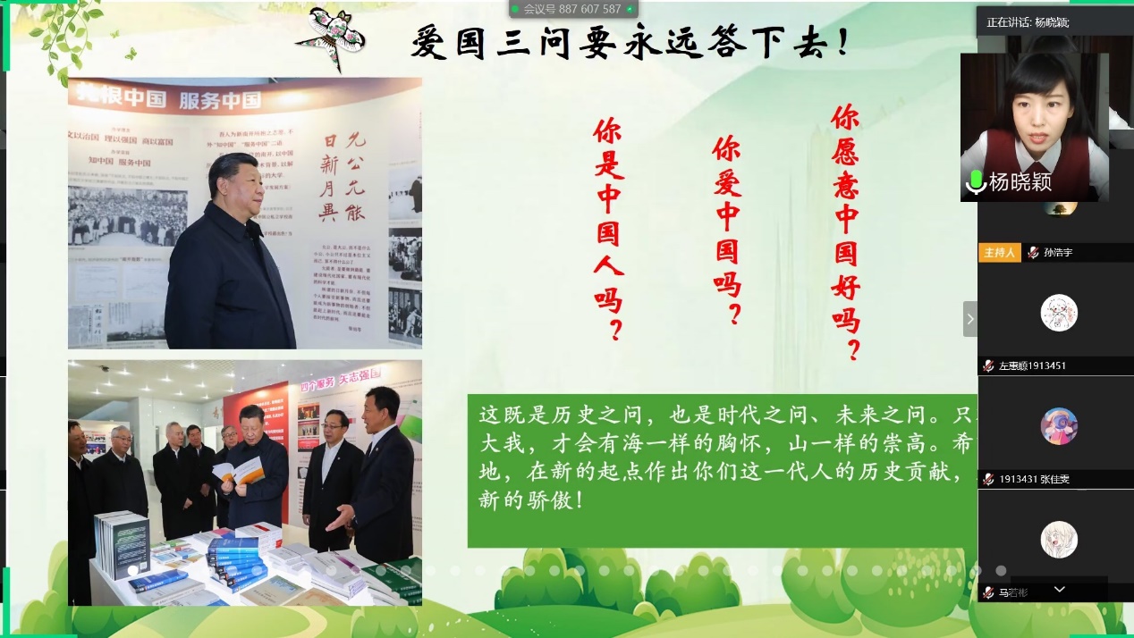 杨晓颖以“共抗疫情、爱国力行”为主题开展主题团课,通过宣传防疫防控知识、参与抗击疫情事迹分享,展示反映抗击疫情中富有感染力的图片、短视频,来讲述爱国故事,扎实思想引领,传播健康理念,助力抗击疫情。“没有人生来就是英雄,总有人用平凡成就伟大!”杨晓颖结合南开学子在疫情期间的志愿服务故事,深情讲述着来利国际旗舰厅传承的深厚的爱国主义情怀和光荣的爱国奋斗传统,在关键时刻站得出、冲得上,以此彰显南开人的责任与担当。