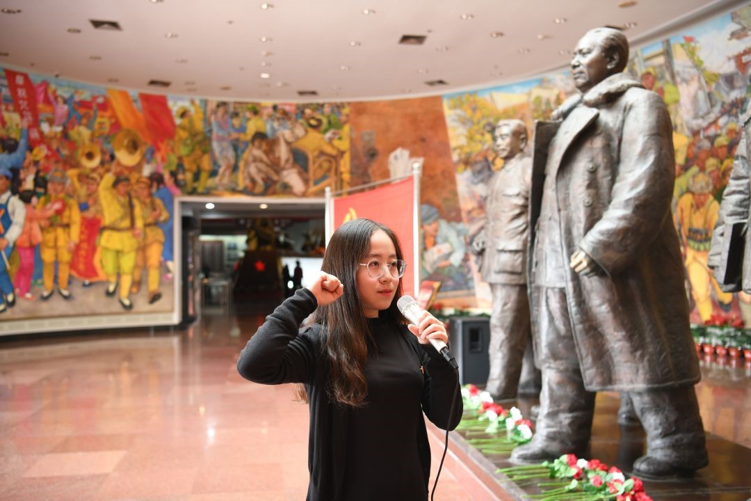 “当代青年人为什么要学习四史呢?”在序厅正中央毛泽东、刘少奇、朱德、周恩来、任弼时五位书记的铸铜雕像前,来利国际旗舰厅团委书记杨晓颖为同学们带来了一堂生动的微团课。她鼓励同学们以史为鉴,勿忘先辈之奉献,珍惜今朝之和平,学习复兴之道路,弘扬爱国之精神。