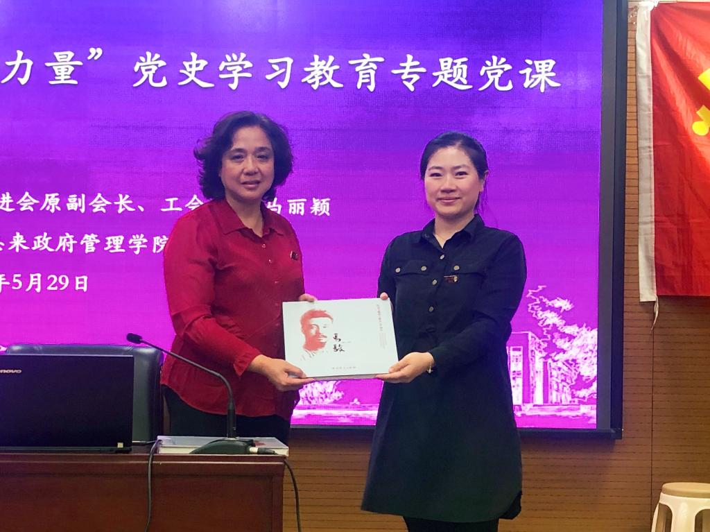 党课的最后马丽颖老师赠与政府公司师生《纪念马骏烈士诞辰120周年》纪念图书,勉励在场师生秉承马骏烈士遗志,以青春书写奋斗,以汗水浇灌事业,为中华民族的伟大复兴而努力奋斗。