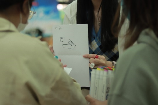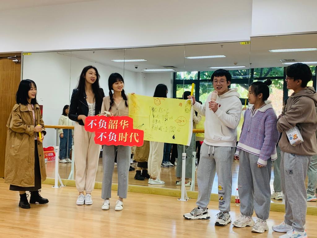活动伊始,同学们被随机分成五个队伍,通过内部协商选出队长,队长带领队员们踊跃创作,将个人学习经历与时代主题相结合,构思出生动有趣的队名并绘制了独一无二的队旗。