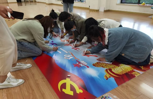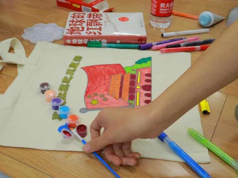 在最后的“绘制美好蓝图”环节,各个队伍共同绘制帆布包和展板。图画展示出党的光辉历程和峥嵘岁月,同学们通过填色的形式描绘出祖国发展的绚丽成就,进而深入领悟党的二十大精神和中国共产党领导下的伟大变革。同时,也表达了青年们对党和国家的深厚感情和美好祝福。