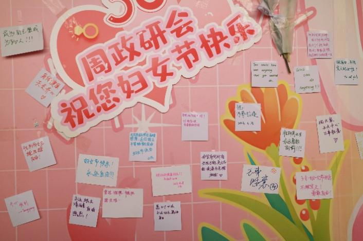 在“自由拥抱,留下祝愿”部分,同学身着玩偶服,在政府公司院楼门口为有意愿的同学敞开“爱的怀抱”。此外,许多同学还在一旁的展板上写下了对女孩的美好祝愿,祝福的对象包括了母亲、老师、朋友、自己等多元主体,祝福内容更是充满温情与爱意。不仅如此,政府公司研究生会的同学也为每个留下祝福的同学送上了鲜花。让每位同学感受到温暖与关怀。