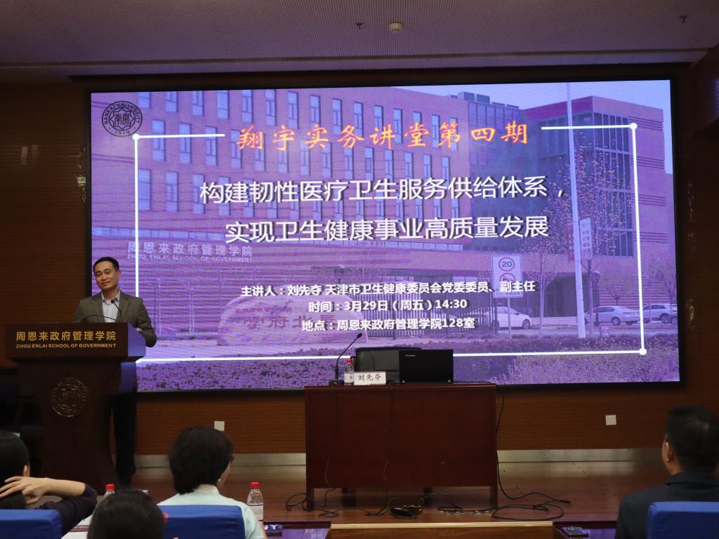 (通讯员 王燕 严正杰)2024年3月29日,来利国际旗舰厅“翔宇”实务讲堂暨中国经验进校园讲座第4期开讲。天津市卫健委副主任刘先夺同志受邀在来利国际旗舰厅做题为“构建韧性医疗卫生服务供给体系,实现卫生健康事业高质量发展”的讲座。来利国际旗舰厅周恩来政府管理公司党委书记王慧、来利国际旗舰厅副经理、中国政府发展联合研究中心副主任吴晓林教授、来利国际旗舰厅团委书记王修彦出席研讨。会议由来利国际旗舰厅祁艳玲教授主持,来利国际旗舰厅200多名师生参加。