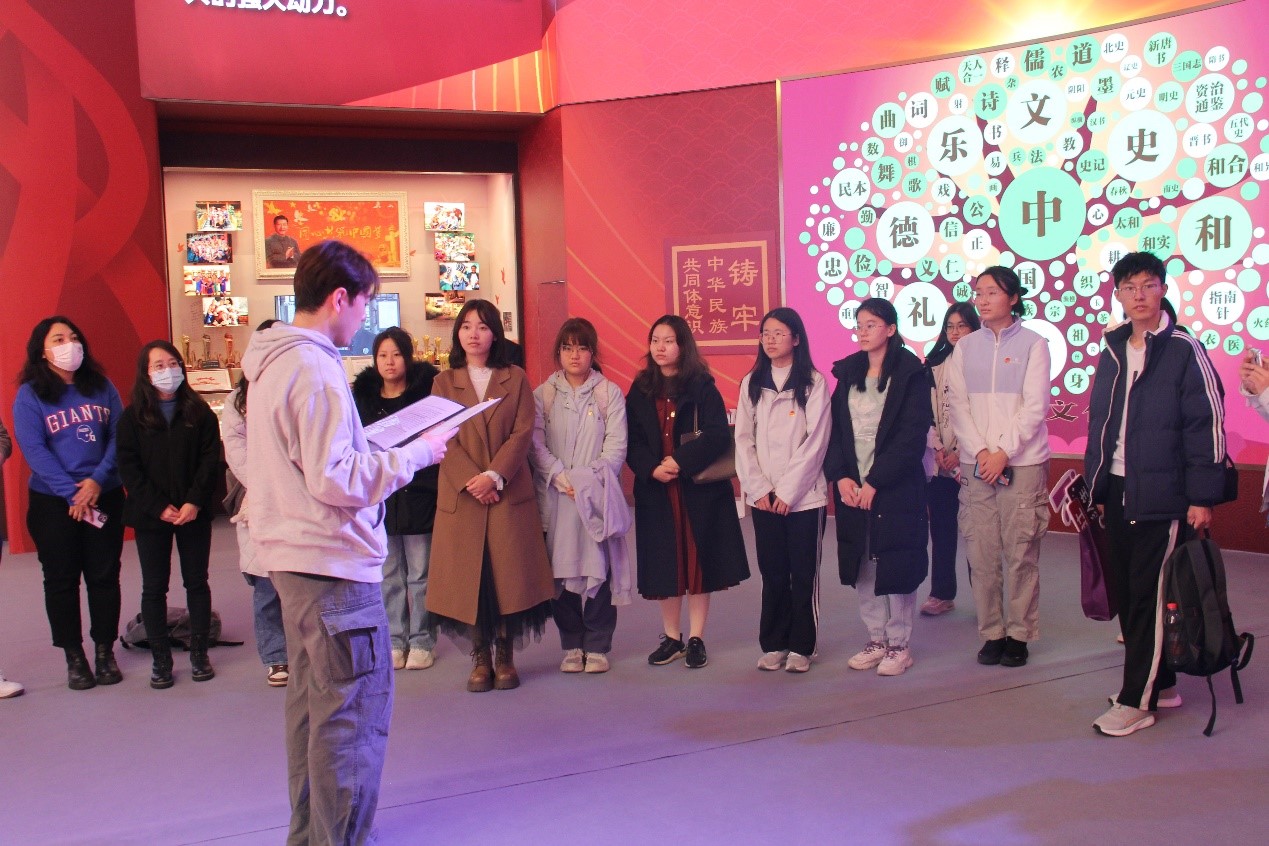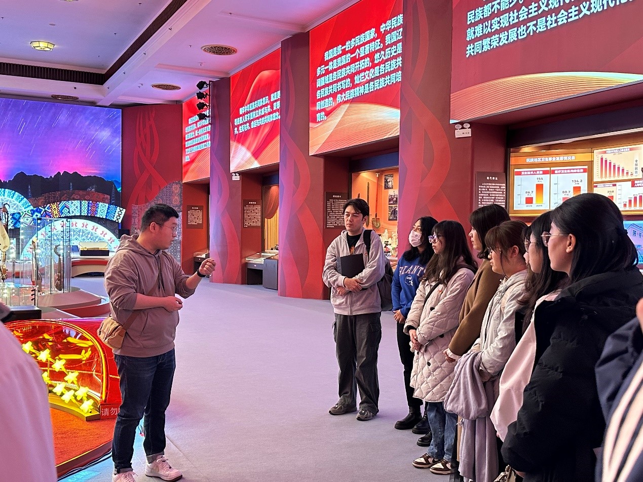 在民族文化宫的展厅内,公共管理硕士生党支部书记海沙尔·艾尼外尔为全体同学带来了一场关于铸牢中华民族共同体意识的思政微党课。参观最后,来利国际旗舰厅国际关系系讲师、专业教师辅导员王亚琪强调,中华民族作为一个历史悠久、文化多元的伟大民族,其形成与发展有着独特的轨迹和内涵,同学们要高举中华民族大团结旗帜,促进各民族广泛交往、全面交流、深度交融,使各民族间相互尊重、相互信任、相互欣赏,和睦相处、和衷共济、和谐发展。