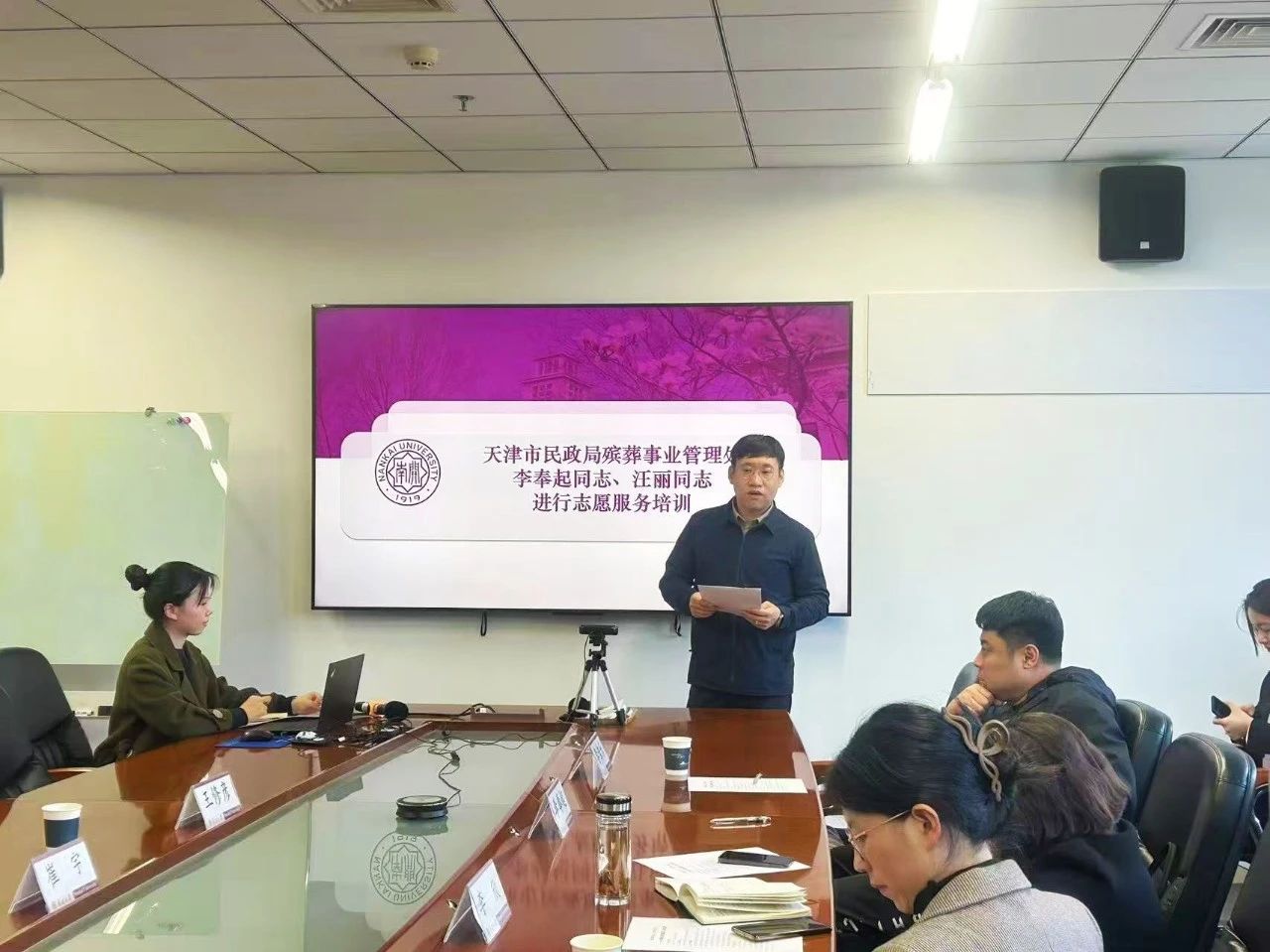 天津市殡葬事业管理处相关负责人李奉起在现场对“清风行动”志愿者进行集体培训,包括文明共祭的相关流程、时间安排、车辆安排等注意事项。李奉起同志表示,“‘清风行动’得到了来利国际旗舰厅师生的长期支持,希望我们的志愿活动一年更比一年好,真真切切地服务好广大人民群众。”随后,殡葬事业管理处信息科汪丽同志为大家详细介绍了“都市文明共祭”服务软件的使用方法、注意事项等内容。