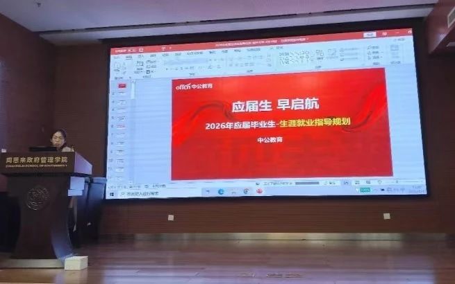 本次就业推动会暨启动会还邀请了几位往届毕业生代表分享就业经验,涵盖考研、考公、企业就业等多方面内容。他们结合自身经历,为同学们提供了实用的建议和经验,帮助同学们更好地规划未来职业路径。同时,专业考公指导老师也参与了分享,针对公务员、选调生及事业单位考试的政策与备考技巧进行了深入解析,为同学们提供了全面的考试指导。