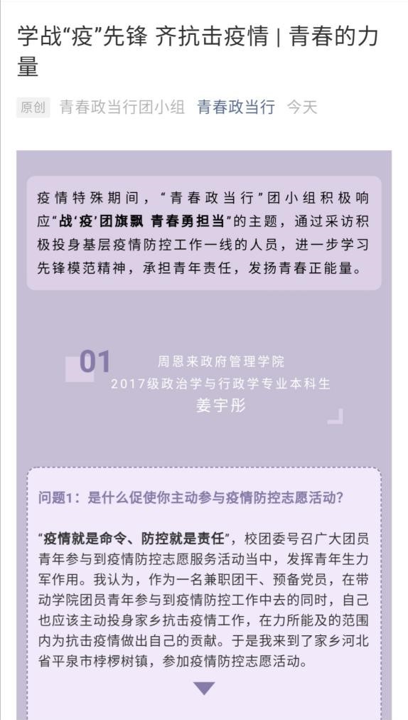 青春政当行团小组积极响应“战‘疫’团旗飘 青春勇担当”的主题团日活动,深入一线采访投身基层疫情防控工作的人员,并在后期将采访成果制作成“战‘疫’先锋”系列专访推送,在团委公众号、班级公众号和团小组公众号发布,号召广大团员青年行动起来,积极参与疫情防控阻击战,学习先锋模范精神,发扬青春正能量,将青春的光彩挥洒在祖国和人民最需要的地方。团小组成员用行动证明了“一代人有一代人的长征,一代人有一代人的担当”,正是每一代青年担当责任的样子,成就了这个国家和民族的当下和未来。
