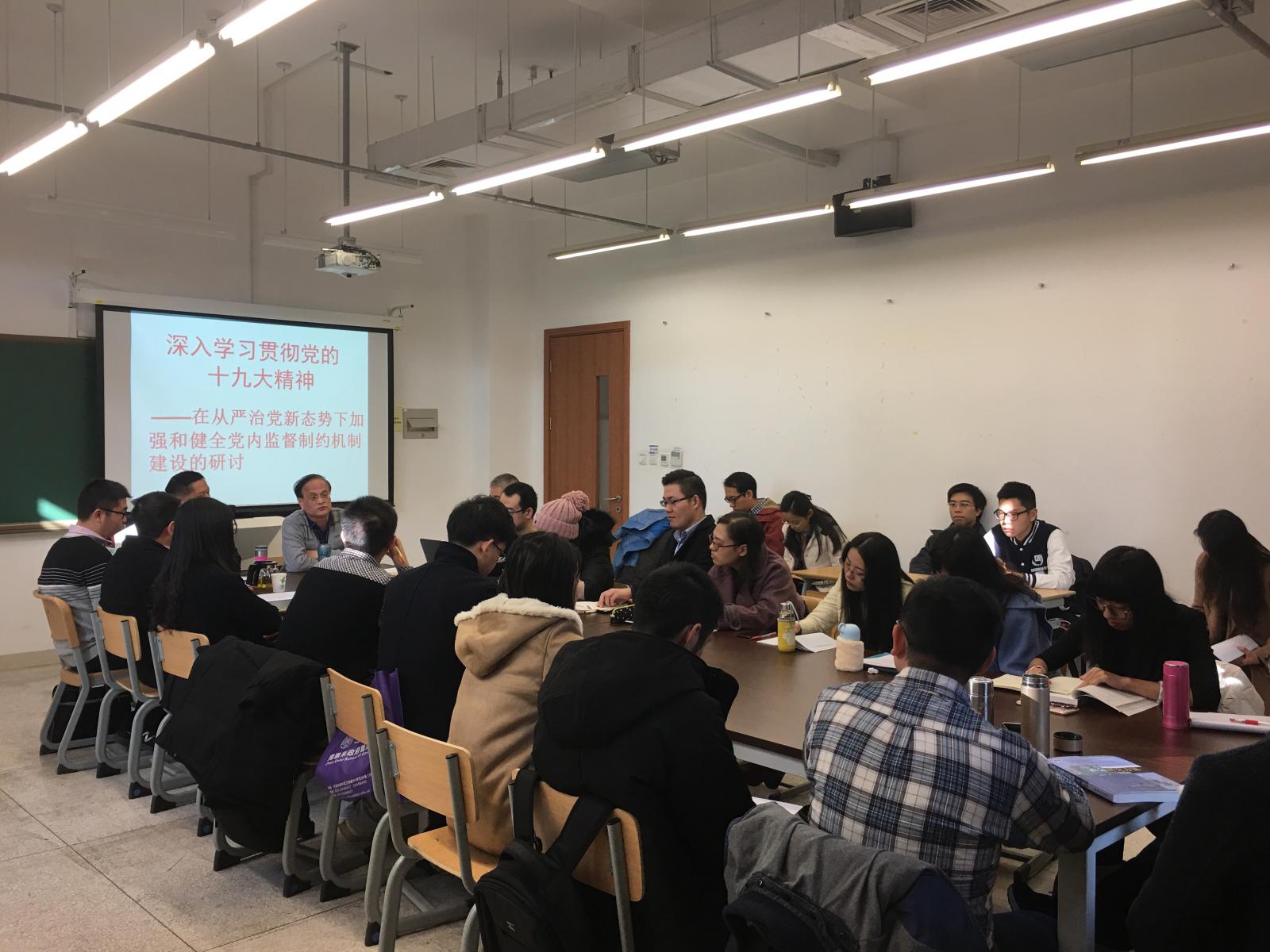天津市司法局干部刘辰君、天津市财政局干部张颖结合自己从事基层党务工作的实践,谈了全面从严治党背景下基层党支部主体责任,基层党务工作者应如何保持党的优良作风,全心全意为人民服务等问题。还有几位博士生就如何深入反腐等问题当场请教了与会专家。