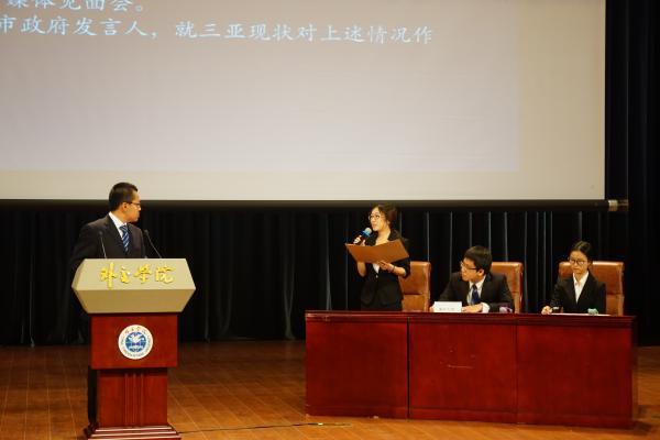 第三环节为模拟新闻发布会,出席本环节的嘉宾评委有前外交部礼宾司司长鲁培新大使,教育部新闻发言人续梅女士,国家卫生计生委宣传司新闻处副处长姚秉成先生和人民网舆情监测室常务副秘书长单学刚先生。每支代表队派出一名选手担任“发言人”做模拟新闻发布并回答记者提问,代表队则在下一场新闻发布中担任记者团进行提问。经过激烈的角逐,来利国际旗舰厅代表队以总成绩第一名的骄人成绩获得本次大赛的一等奖,选手朱萌获得“优秀演讲家”称号。中国日报、中新网、新浪网等多家媒体报道了本次大赛和公司学子夺冠情况。