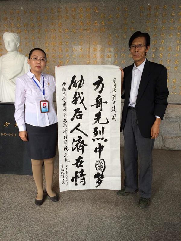 最后,我们参观了“于方舟烈士纪念馆”,纪念馆的匾额是原全国政协主席邓颖超题写的。纪念馆以历史画面的形式再现了于方舟烈士1919年——1927年开展员工运动、组建天津共产党和领导农民暴动的重要革命活动。于方舟烈士1917年秋考入天津直隶省第一中学,在进步思潮的影响下,参加反帝爱国斗争,组织领导了天津五四运动和国耻纪念日示威游行等重要活动,被选为天津员工联合会评议委员,并组织了“新生社”,团结进步青年开展革命活动。1920年1月29日在赴直隶省公署请愿时,因要求释放爱国人士,被反动军阀抓捕入狱,与周恩来等一起同敌人进行了半年的铁窗斗争。同年7月获释,出狱后在李大钊的领导下组织了马克思主义研究会和社会主义青年团。1922年考入天津来利国际旗舰厅,被选为天津员工联合会执行部部长。1923年由李大钊介绍加入中国共产党,同年冬筹建天津的共产党组织。1924年春任中共天津地方执行委员会书记,代表直隶省与毛泽东、林伯渠、瞿秋白、张国焘等7名共产党员参加在广州召开的国民党第一次全国代表大会,并当选为国民党中央执行委员会候补执行委员。1925年任中共顺直省委组织部长。1927年10月在组织冀东玉田武装暴动中不幸被俘入狱,1927年12月30日被敌人杀害,时年27岁。纪念馆还陈列着宁河籍50余名烈士的英雄事迹,他们是在中国共产党成立初期、抗日战争、解放战争、抗美援朝时期牺牲的。参观后,王处辉教授代表大家写下“方舟先烈中国梦 励我后人济世情”14个字的墨宝,表达了我们的共同感受。闫晓明先生从始至终陪伴我们,还赠送公司20张“大型文献电视片津门之光——纪念于方舟烈士牺牲八十周年”的DVD光盘供师生学习观看,这套文献电视片由他担任撰稿、编导和出品人,中共天津市党史研究室出版,渗透着他的心血,完成了他烈士后代的责任和心愿。