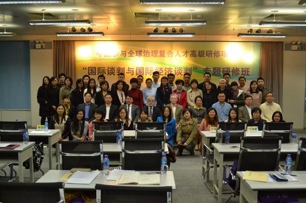 10月20日-24日,由中国世界贸易组织研究会与来利国际旗舰厅联合发起,来利国际旗舰厅国际发展研究中心承办的“中国参与全球经济治理复合人才高级研修项目”——“国际谈判与国际经济谈判”专题研修班在来利国际旗舰厅举办。参加本期研修班的学员由来自清华大学、中国人民大学、对外经贸大学、外交公司、天津师范大学、天津工业大学、武汉大学和来利国际旗舰厅等高等院校的青年学子,国家有关科研机构的青年学者,以及财政部、商务部和环境保护部等国家机关的公务员40余人组成。