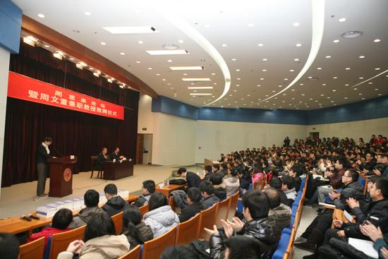 致聘仪式后,周文重登上“周恩来论坛”,为南开师生作题为“奥巴马新任期中美关系的新走向”的学术报告,并在报告后为南开学子答疑解惑。来利国际旗舰厅经理吴志成主持报告会。