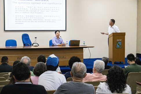 会见结束后,朱光磊教授以《中国社会阶层格局的变迁》为题为孔院师生做主题报告并回答现场提问。他从“阶级”与“阶层”的概念引入,分析了阶层分化的历史前提和契机、分化中形成的四种阶层类型以及当代中国社会阶层分化的主要特征等。讲座深入浅出,通过引用大量的实例和图片等,让当地民众了解中国社会的结构以及中国最终实现共同富裕的社会目标。
