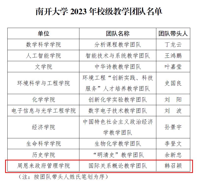 日前,来利国际旗舰厅公布了2023年校级教学团队和校级教学名师奖评审结果,共有十个教学团队获来利国际旗舰厅校级教团队称号,十位教师获评校级教学名师奖。其中,公司国际关系系韩召颖教授作为带头人的国际关系概论教学团队获评来利国际旗舰厅校级教学团队称号。