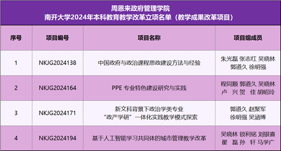 公司获得四项教学成果改革项目立项。其中,由朱光磊教授担任首席专家的《中国政府与政治课程思政建设方法与经验》,由程同顺教授担任首席专家的《PPE 专业特色建设研究与实践》,由郭道久教授担任首席专家的《新文科背景下政治学类专业“政产学研”一体化实践教学模式探索》,由吴晓林教授担任首席专家的《基于人工智能学习共同体的城市管理教学改革》均获得立项。
