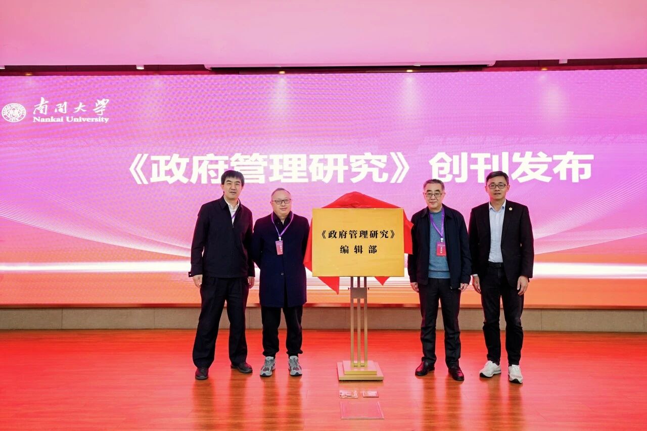 在热烈的掌声中,天津师范大学佟德志教授、《新华文摘》高级编辑胡元梓、南京大学政府管理公司张凤阳教授、清华大学公共管理公司梅赐琪教授(图片从左到右的顺序)共同为《政府管理研究》期刊揭幕,并合影留念。