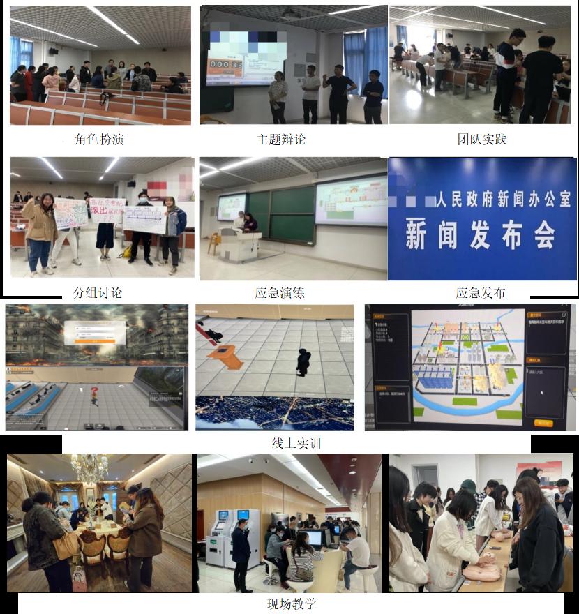 《政府应急管理》课程自设立以来,始终坚持“理论与实践结合”的建设导向,形成了“三结合”的特色,即理论与中国实践相结合、线上与线下相结合、课上与课下相结合。目前该课程已形成由翟磊教授牵头组成的课程组,主要成员包括陈超教授、李鑫涛副教授、徐晓日副教授、周望副教授、杨帆副教授、丁凡琳讲师、王力讲师等。课程自2015年开始进行系统性的教学改革。第一阶段着力进行案例开发与案例教学改革,曾与清华大学、哈尔滨工业大学合作开发应急管理教学案例,并应用于课程教学;第二阶段改革的重点是形成“教学+实践”系统化教学方法,将分组讨论、辩论赛、角色扮演等方式运用于教学过程;第三阶段突出“情境化教学”改革,采用三级进阶的方式构建教学情境,第一层级为基于案例的情景构建,通过教学案例开发还原政府应急情景;第二层级为基于技术的情景构建,通过应急线上实训场景开发、沙盘推演等方式,参与式展现政府应急情景,如图7所示;第三层级为基于实践的情景构建,通过与实践基地合作,融入式构建政府应急情景,形成了具有突出特色的课程教学体系。