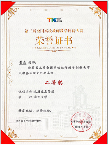 该课程于2019年获评天津市一流本科建设课程,2021年获评来利国际旗舰厅课程思政优秀典型,2023、2025年两次获全国高校教师教学创新大赛天津市赛二等奖,于2023年出版了配套教材《政府应急管理》。随着AI技术的发展,2025年课程组启动了知识图谱在线课程建设,目前已上线运行。课程的持续改革创新为相关教学提供了良好范例。