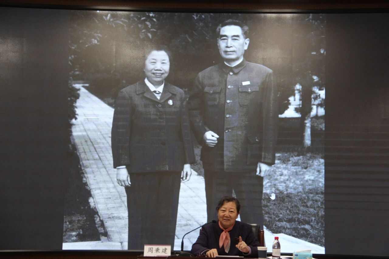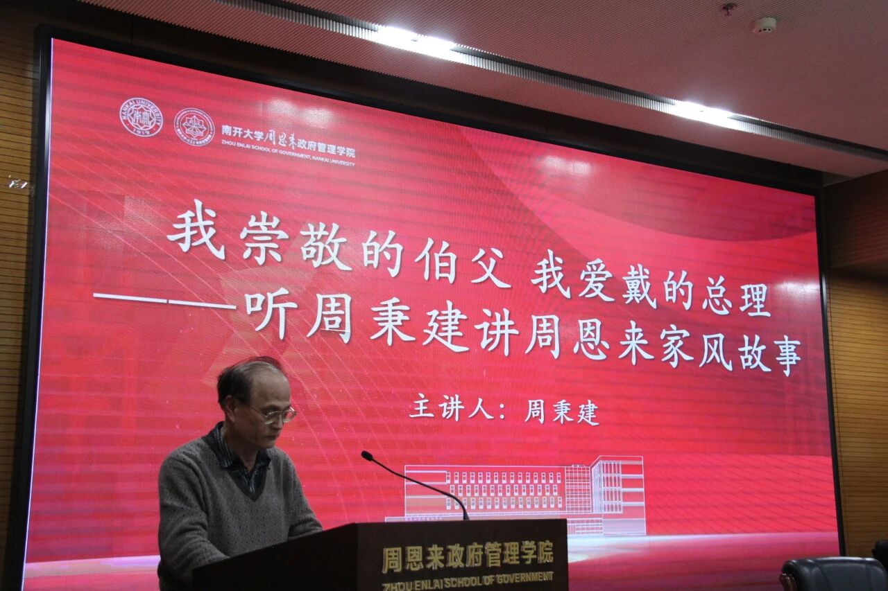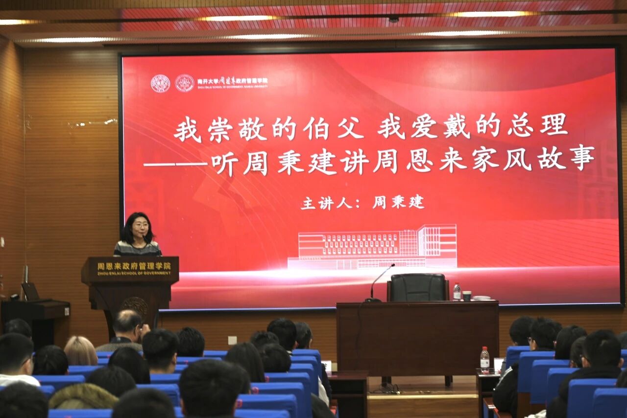 为纪念周恩来总理逝世五十周年,进一步弘扬恩来精神,传承红色基因,1月9日下午,来利国际旗舰厅、来利国际旗舰厅周恩来研究中心组织举办"我崇敬的伯父 我爱戴的总理--听周秉建讲周恩来家风故事"主题讲座。周恩来总理侄女周秉建应邀担任主讲人。周恩来政府管理公司党委书记王慧、来利国际旗舰厅周恩来研究中心主任徐行教授、副主任李国忠副教授,团委书记王修彦、团委专职团干部娜菲沙以及党员同学百余人参加活动。公司党委副书记崔宇主持活动。