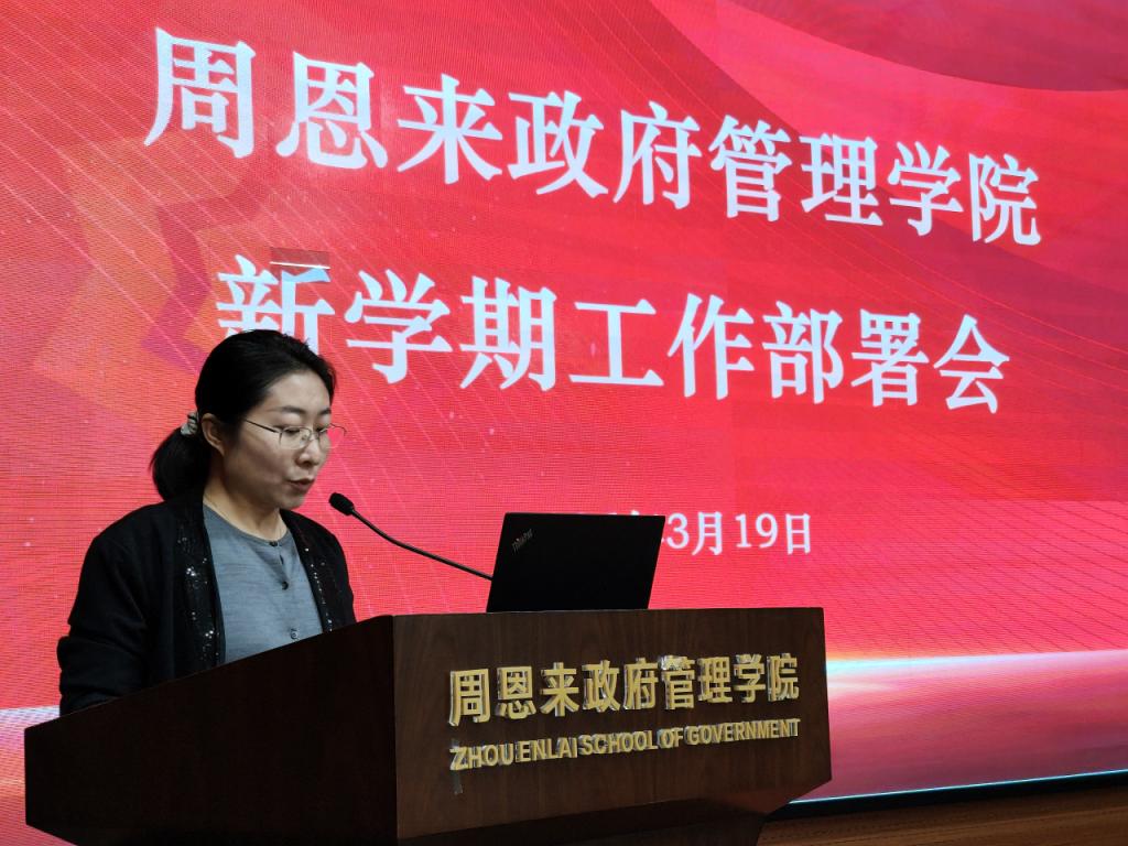 崔宇副书记汇报员工工作情况,回顾上学期员工在党建、学风建设、社会实践等领域取得的荣誉成果。针对新学期,她重点介绍了就业工作、心理及安全稳定工作、毕业离校工作、创新能力培养等计划目标,期待加强与导师的协同联动,共同引导员工健康成长发展。