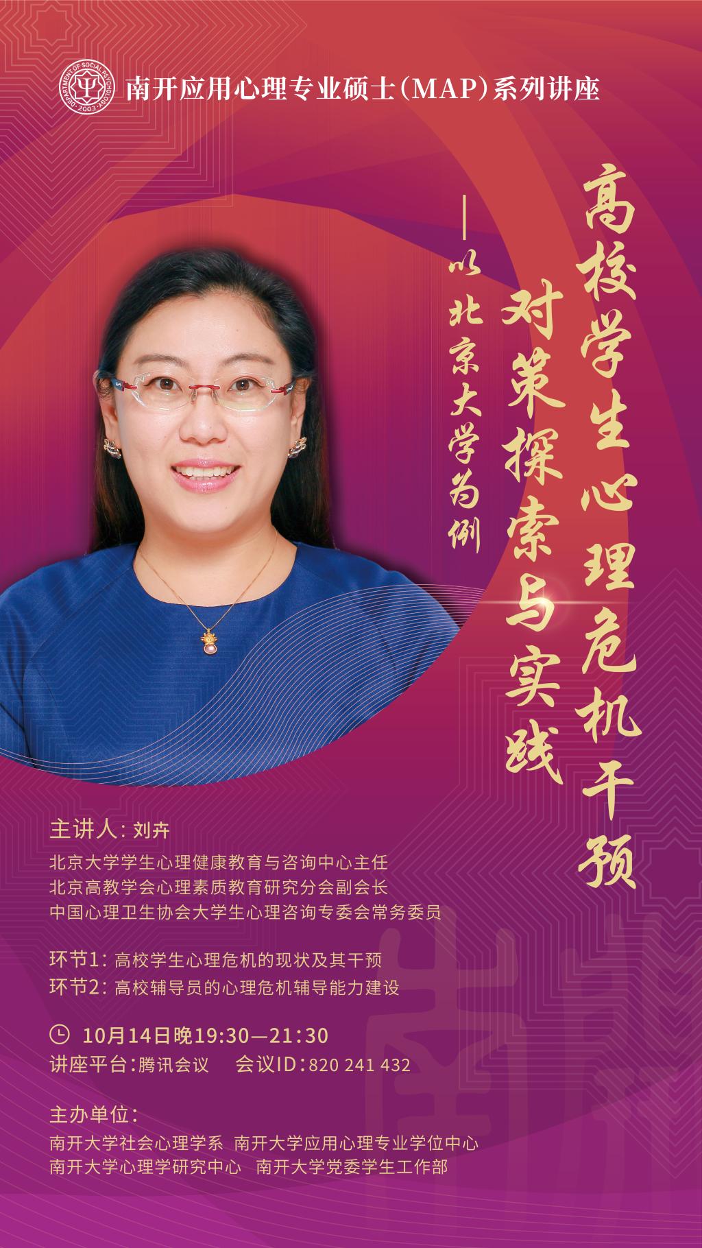 主讲人简介:刘卉,北京大学员工心理健康教育与咨询中心主任,北京高教学会心理素质教育研究分会副会长,中国心理卫生协会老员工心理咨询专委会常务委员时间:10月14日晚19:30—21:30腾讯会议地址:820 241 432