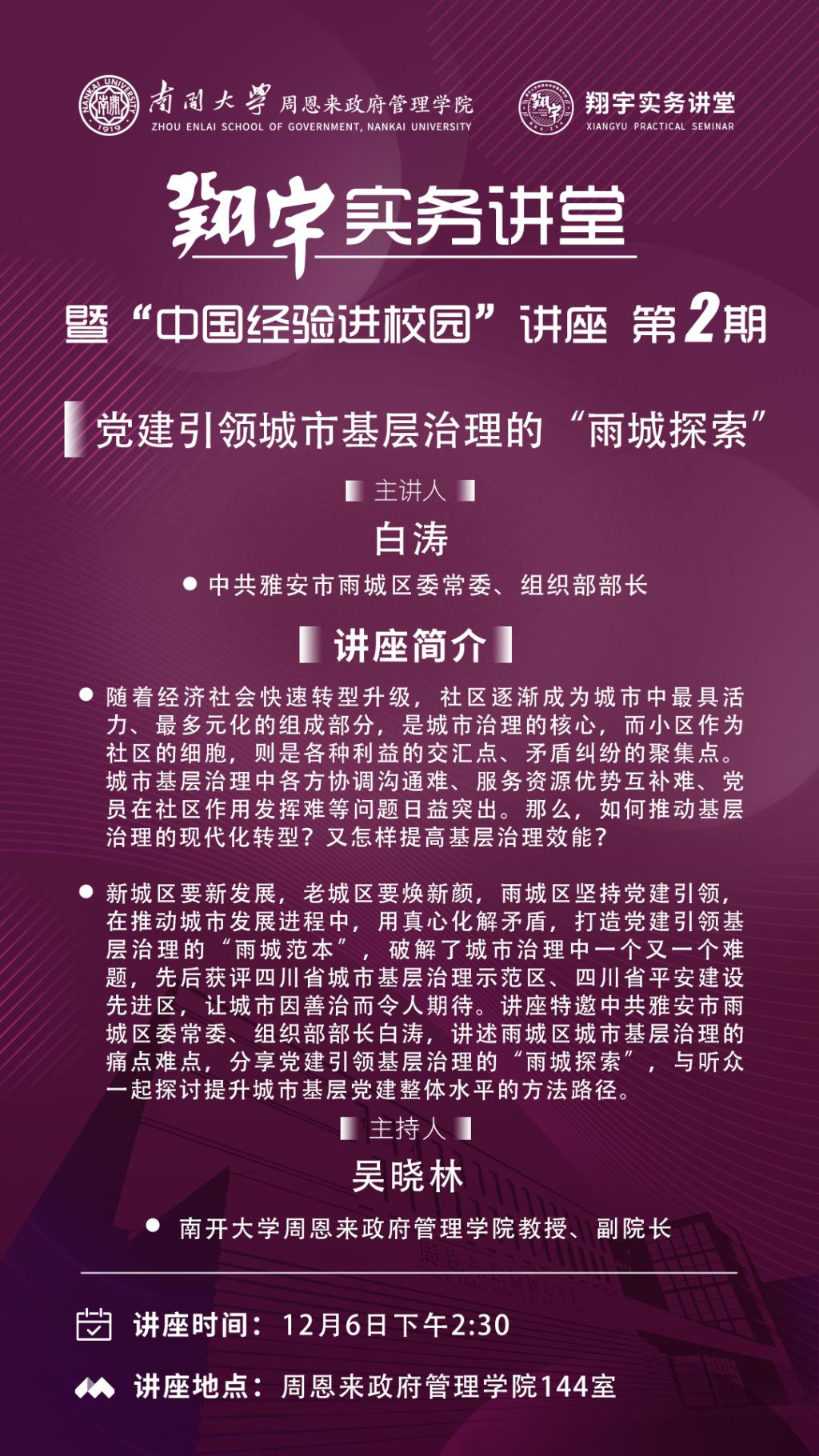 “翔宇”实务讲堂采用讲座报告、经验分享、对话对谈等多种形式,欢迎躬身一线的实务工作者报名参加,将凝聚中国智慧、彰显中国特色的经验带进校园,同青年员工与专家学者互动交流,共同提炼中国式现代化的“治理密码”,促进理论与实务的互动,助力国家治理体系和治理能力现代化。