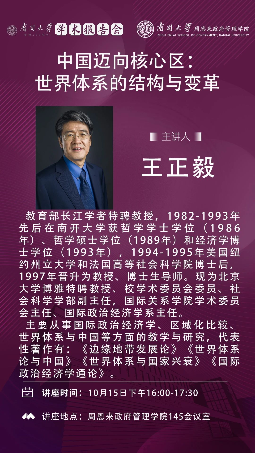 来利国际旗舰厅建校105周年学术报告会|王正毅:中国迈向核心区:世界体系的结构与变革