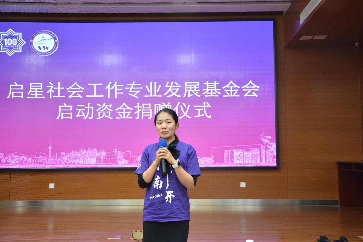 致辞发言结束后举行了“启星社会工作发展基金”的启动仪式。第三届周恩来班2005级社会工作本科班级发起建立基金的倡议,班级代表阿依古丽以参与汶川地震灾区重建专业化服务的经历为例呈现了建立社会工作基金的重要作用。吴帆教授简要介绍了基金成立的流程,表达了希望基金用于员工奖学助学、专业服务支持和团队建设的殷切期望。2012级本科毕业生朱功伟在启动仪式上表示希望能通过自己的努力为在校同学们创造更多的机会。